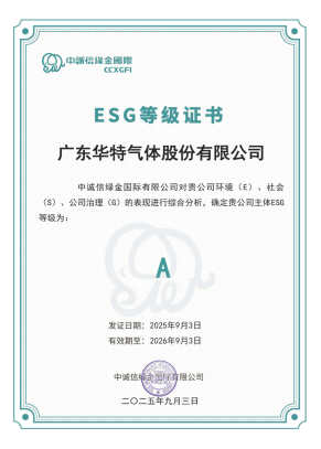 近日,華特氣體在ESG領(lǐng)域取得重要突破,經(jīng)中誠信綠金國際有限公司綜合評(píng)定,公司ESG等級(jí)獲評(píng)A級(jí),標(biāo)志著公司在環(huán)境、社會(huì)及公司治理方面的卓越表現(xiàn)獲得專業(yè)認(rèn)可。